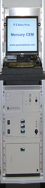 Full scale plant systems need to be able to handle harsh operating conditions with minimal operator attention. Conversely lab scale systems have to be able to handle rapid changes in operating conditions set up which requires more operator intervention. Pilot plants can vary in size from just above lab scale to full scale plants so analyser requirements can vary greatly. We describe systems for full scale plants here with recommendations for pilot plant and lab systems. The operational systems consist of Mercury CEM analyser with an appropriate probe/sample conditioning system.. The Mercury CEMSince 1996 PS Analytical has sold in excess of 50 PSA CEMs for Mercury Analysis which have been used to test in excess of 250 power plants worldwide. These are installed on sites using various fuel types producing different stack gas compositions. They are also located within plants to measure the different processes including upstream and downstream of particulate removal devices (ESP, bag-houses), deNOx units, wet/dry scrubbers and flue gas. More than 90% of these installations use the Hg CEM for speciation measurements to establish the efficiency of the control technology. The PSA mercury CEM contains the PSA 10.525 Sir Galahad mercury monitor. Mercury vapour generator, stream selector valves, industrial PC and controllers all mounted in an enclosed monitor cabinet with calibration kit. All of the analysers have the following capabilities: